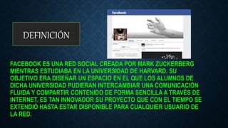 Mark Zuckerberg creó Facebook mientras estudiaba en la Universidad de Harvard como un espacio para que los estudiantes compartieran contenido e intercambiaran comunicaciones de forma sencilla. Inicialmente solo estaba disponible para estudiantes de Harvard, pero rápidamente se expandió a otras universidades y eventualmente a cualquier usuario a nivel mundial, convirtiéndose en una de las redes sociales más grandes.