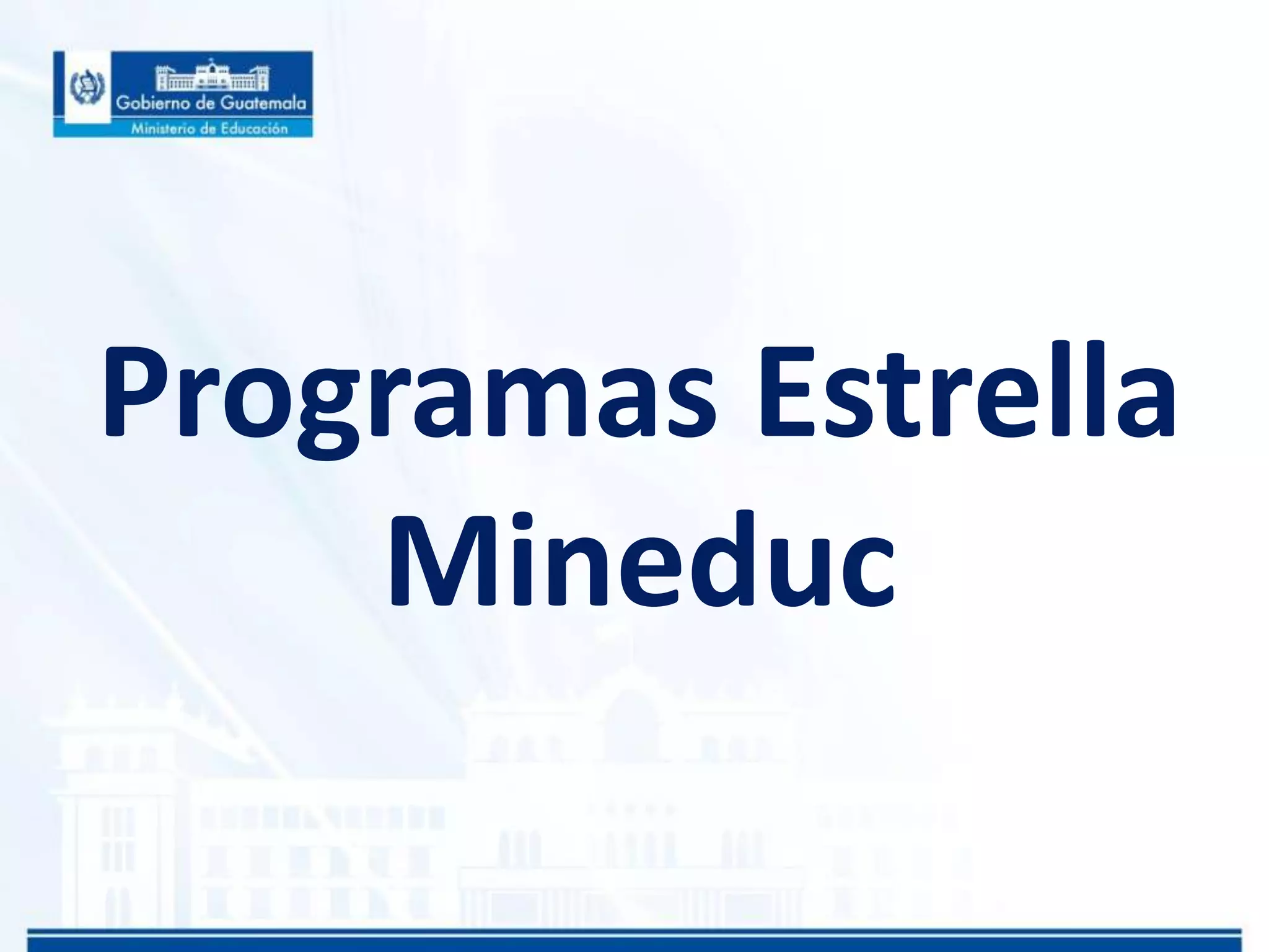 El documento enumera 14 programas estrella del Ministerio de Educación de Guatemala, incluyendo el Programa Nacional de Lectura, la implementación del Currículo Nacional Base, programas de tecnología para escuelas, educación bilingüe intercultural y estrategias para mejorar la calidad de la educación para niños y jóvenes guatemaltecos.