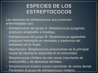 Las especies de estreptococos más importantes desde el punto de vista médico son S. pyogenes, S. agalactiae, S. pneumoniae, S. viridans y S. mutans. Causan enfermedades como amigdalitis, meningitis neonatal, neumonía adquirida en la comunidad, endocarditis y caries dental. Los estreptococos son cocos gram positivos que crecen en parejas o cadenas y son catalasa negativos.