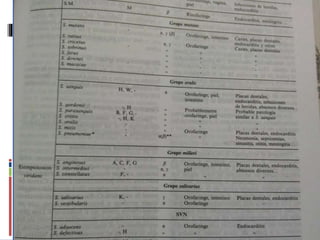 Este documento proporciona información general sobre los estreptococos. Explica que son cocos Gram positivos que crecen en cadenas o pares, son anaerobios facultativos y producen ácidos que descienden el pH. Se clasifican según su tipo de hemólisis y estructura antigénica. Incluye detalles sobre estreptococos viridans que colonizan la cavidad oral y son responsables de la formación de placas y caries dentales, y sobre los estreptococos del grupo mutans que son particularmente acidogénicos y adhes