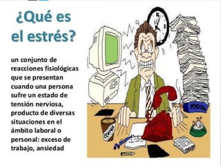 Este documento describe dos tipos principales de estrés: agudo y crónico. El estrés agudo es a corto plazo y ayuda a manejar situaciones peligrosas, mientras que el estrés crónico dura por más tiempo y puede causar problemas de salud. También explica cómo el estrés afecta el cuerpo al liberar hormonas y ponerlo en alerta, lo que con el tiempo puede causar presión arterial alta, problemas cardíacos, diabetes y otros problemas. Finalmente, identifica algunas señales comunes de estrés excesivo y cuando una persona de