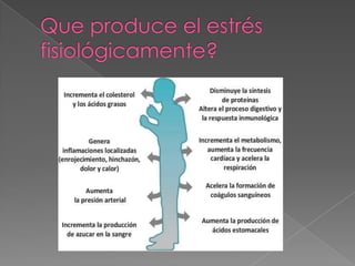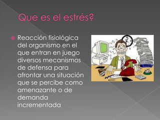 El documento describe el estrés como la reacción fisiológica del organismo ante situaciones percibidas como amenazantes o exigentes, en la que se liberan sustancias como la adrenalina para combatir o huir. Explica que el estrés pasa por tres fases y puede tener consecuencias negativas o positivas, dependiendo de si es distrés o eustrés. También identifica diferentes tipos de estresores y sus efectos a nivel neuronal.