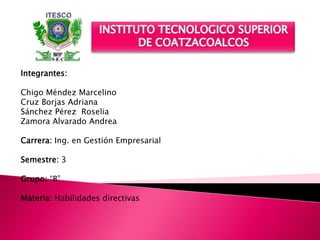 El documento presenta un grupo de estudiantes de la carrera de Ingeniería en Gestión Empresarial del semestre 3 perteneciente al grupo B que cursa la materia de Habilidades Directivas. El grupo está integrado por Chigo Méndez Marcelino, Cruz Borjas Adriana, Sánchez Pérez Roselia y Zamora Alvarado Andrea.