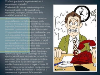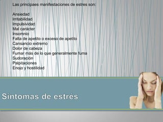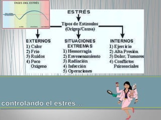 El estrés es una respuesta fisiológica natural ante situaciones amenazantes, aunque puede confundirse con una patología si se vuelve crónico, generando problemas como ansiedad e insomnio. Se presentan diez estrategias para manejar el estrés, que incluyen alimentación adecuada, ejercicio, establecer límites y practicar técnicas de relajación. Además, un estudio sugiere que la ingesta de colina durante el embarazo influye en la capacidad de los hijos para manejar el estrés al disminuir los niveles de cortisol.