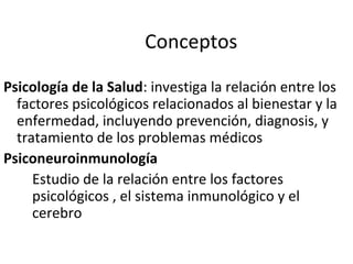 Este documento trata sobre la psicología de la salud. Explica conceptos como la psicología de la salud, la psiconeuroinmunología y el estrés. También describe cómo el estrés y los factores psicológicos pueden afectar la salud y causar enfermedades psicosomáticas. Además, analiza el síndrome de adaptación general de Hans Selye y diferentes tipos de estrés y estresores.