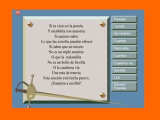 El documento resume diferentes formas poéticas como el verso, la estrofa, el poema estrófico y el poema de verso libre. Explica que un poema está compuesto de estrofas y cada estrofa de versos. Da ejemplos de poemas estróficos como el soneto, villancico y estribillo. Define el poema de verso libre como aquel que deja las palabras fluir sin ataduras métricas, pero con talento. Finalmente, incluye un soneto como ejemplo.