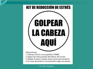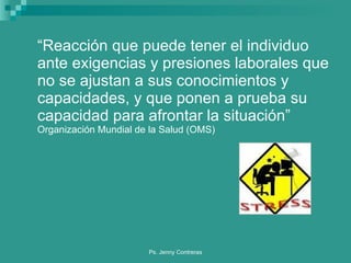 El documento habla sobre el estrés laboral, definiéndolo como una reacción ante presiones laborales que superan las capacidades del individuo. Explica que se produce por un desequilibrio entre las demandas del ambiente y los recursos de la persona. Describe los síntomas del estrés, divididos en emocionales, cognitivos, conductuales y físicos. También habla sobre el estrés crónico y el síndrome de burnout. Finalmente, proporciona estrategias para afrontar el estrés como relajarse, hacer ejercicio, mantener una