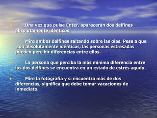 Este documento presenta una prueba para medir el estrés mediante la observación de dos delfines idénticos saltando en las olas. Si una persona percibe diferencias entre los delfines, se encuentra en un estado de estrés agudo. Si encuentra más de dos diferencias, necesita tomar vacaciones de inmediato para reducir su nivel de estrés.