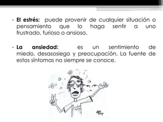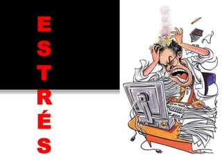 El documento describe las diferentes formas de estrés, incluyendo el estrés, la ansiedad, las causas y síntomas del estrés, y los tipos de estrés. También discute el estrés en la niñez y el estrés laboral, señalando que el estrés puede ser provocado por cambios en el trabajo, la familia o la rutina diaria y puede manifestarse a través de síntomas físicos y emocionales.