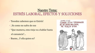 El documento habla sobre el estrés laboral, sus efectos y posibles soluciones. El estrés laboral puede causar problemas de salud y baja autoestima si no se controla. Algunos factores que lo producen son el ambiente de trabajo, las relaciones interpersonales y la falta de organización. Para prevenirlo, es importante desarrollar inteligencia emocional, mantener una autoestima positiva y aprender formas saludables de manejar la presión laboral como tomar descansos y establecer límites.