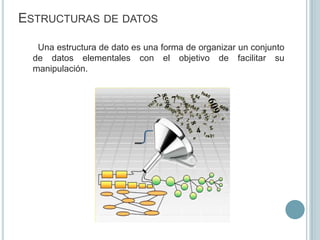 El documento describe las estructuras de datos y su relación con los sistemas operativos. Explica que una estructura de datos organiza un conjunto de datos para facilitar su manipulación y define operaciones como alta, baja y búsqueda. Luego, indica que un sistema operativo permite la comunicación entre usuario y computadora y utiliza estructuras de datos como tablas de memoria, ficheros, dispositivos de entrada/salida y procesos para controlar la memoria, archivos, periféricos y procesos respectivamente.