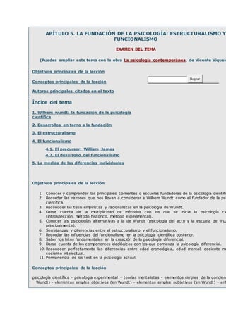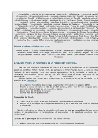 Este documento resume los principales hitos en el desarrollo de la psicología científica desde su fundación por Wilhelm Wundt en 1879 hasta principios del siglo XX. Se describe el enfoque elementalista de Wundt y su uso pionero de la introspección experimental y el método científico. También se mencionan las contribuciones de Franz Brentano a través de su psicología del acto y el desarrollo posterior del estructuralismo y funcionalismo.