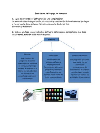 La lección describe la estructura básica de una computadora. Explica que consta de dos partes principales: el software y el hardware. El software incluye programas de utilidad, aplicaciones y sistemas operativos. El hardware incluye dispositivos de entrada y salida de datos, procesamiento, y almacenamiento. También explica el proceso básico de cómo funciona un computador al recibir una orden del usuario.