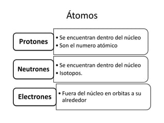 El documento describe la estructura atómica y los elementos químicos. Explica que los átomos están compuestos de protones, neutrones y electrones y que los elementos se organizan en la tabla periódica según sus propiedades periódicas como la electronegatividad y la energía de ionización. También discute los modelos atómicos históricos y la nomenclatura y simbología química.