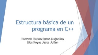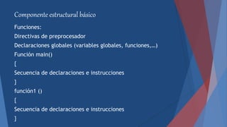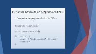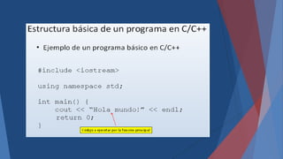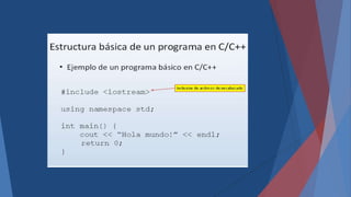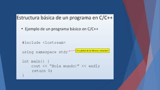 El documento describe la estructura básica de un programa en C++, incluyendo funciones, directivas de preprocesador, declaraciones globales, la función main, tipos de datos básicos como enteros, flotantes y caracteres, y el proceso de compilación y ejecución de un programa C++.
