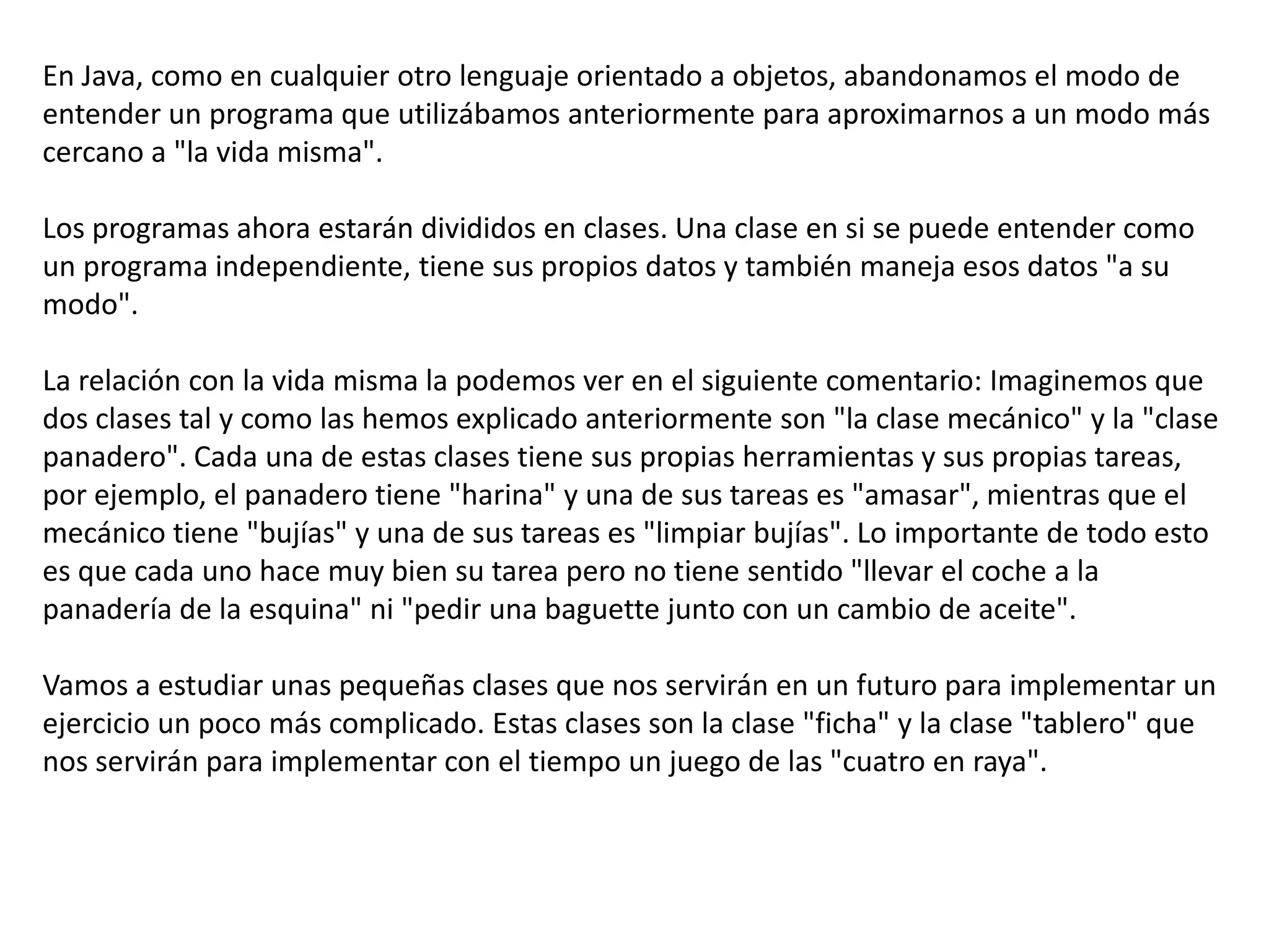 Este documento describe la estructura básica del lenguaje de programación Java. Explica que en Java, como en otros lenguajes orientados a objetos, los programas se dividen en clases. Cada clase tiene sus propios datos y métodos para manejar esos datos. A modo de ejemplo, presenta dos clases simples: la clase "Ficha" que representa las fichas de un juego, con un atributo de color y métodos para establecer y obtener el color, y la clase "Tablero" que representa el tablero del juego, con un