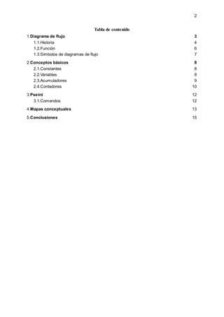 Este documento describe conceptos básicos relacionados con diagramas de flujo y programación, incluyendo la historia y función de los diagramas de flujo, símbolos comúnmente usados y conceptos como variables, constantes, acumuladores y contadores. El documento provee información fundamental sobre herramientas y métodos para el diseño de algoritmos y programas de computadora.