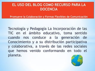 Este documento describe las características y usos de los blogs como recursos educativos. Explica que un blog es un sitio web actualizado periódicamente que presenta artículos de uno o más autores en orden cronológico inverso. Los blogs se caracterizan por presentar información breve con enlaces que amplían el contenido de forma amigable. Promueven la colaboración y comunicación flexible al ser espacios abiertos para interactuar.