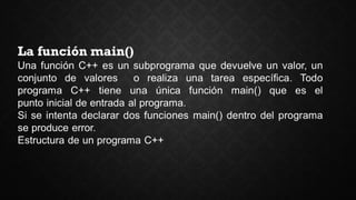El documento describe la estructura básica de un programa en C++. Un programa en C++ consta de directivas de preprocesador, declaraciones globales, una función principal y otras funciones auxiliares. Cada función contiene una secuencia de declaraciones e instrucciones entre llaves. El documento también explica los tipos de datos básicos en C++ como enteros, reales, caracteres y lógicos.