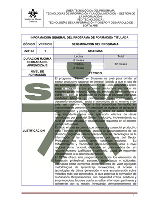 Este documento describe un programa de formación técnica en sistemas. El programa dura 12 meses y capacita a los estudiantes en el mantenimiento de hardware, implementación de redes, y uso de herramientas informáticas. El objetivo es brindar personal calificado a las empresas para mejorar la productividad a través de la aplicación de tecnologías de la información. El programa desarrolla competencias técnicas y blandas en los estudiantes a través de metodologías innovadoras y el uso de tecnología.