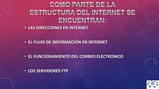 El documento describe los conceptos básicos de Internet y las redes de computadoras. Explica que Internet es una red global que conecta ordenadores de todo el mundo utilizando el protocolo TCP/IP. También describe las direcciones IP, los dominios, los correos electrónicos, las URLs y los protocolos como SMTP, POP e IMAP que permiten el intercambio de información. Finalmente, define las redes LAN, MAN y WAN indicando que las LAN son redes privadas locales, las WAN se extienden a largas distancias, y las MAN son una versión mayor