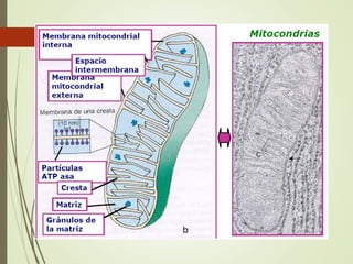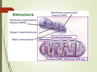 Las mitocondrias son orgánulos celulares que generan energía para la célula a través de la oxidación de nutrientes. Constan de ADN propio, ribosomas y enzimas similares a los de las bacterias. Están formadas por dos membranas y contienen crestas que aumentan su superficie. En su matriz se llevan a cabo reacciones metabólicas como el ciclo de Krebs y la beta oxidación de ácidos grasos para producir ATP.