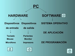El documento describe la estructura básica de una PC, incluyendo el hardware (teclado, mouse, monitor, micrófono, parlantes, impresora), software (sistema operativo, aplicaciones, programación) y sus funciones. Explica que el sistema operativo actúa como interfaz entre el hardware y software, y que las aplicaciones permiten realizar tareas específicas. Además, detalla las funciones del teclado, mouse, micrófono, parlantes e impresora.
