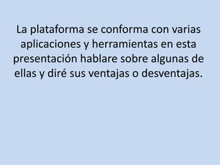 El documento describe la estructura de una plataforma educativa virtual, destacando las principales aplicaciones y herramientas que la componen. Entre ellas se encuentran chats y foros para la comunicación en tiempo real o el debate de temas, un glosario y calendario para consultar definiciones y fechas, así como wikis, cuestionarios y herramientas de búsqueda para compartir información y evaluar el aprendizaje.