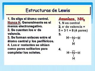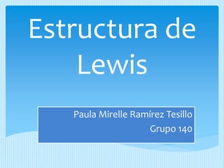 El documento describe la estructura de Lewis, propuesta por Gilbert Lewis en 1916 para representar la estructura molecular. La estructura de Lewis usa símbolos de elementos rodeados por electrones de valencia para mostrar enlaces químicos. El método predice con efectividad la geometría molecular al combinarse con la teoría de repulsión de pares electrónicos de la capa de valencia. A continuación, se detallan las reglas y pasos para construir estructuras de Lewis.