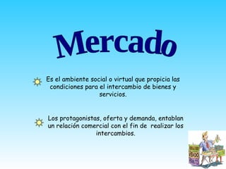 Un mercado es el ambiente donde oferta y demanda interactúan para realizar intercambios de bienes y servicios. Las empresas compiten entre sí para atraer clientes, representando el grado de rivalidad dentro de un mercado. El mercado es el motor de la eficiencia del sistema económico al equilibrar oferta y demanda a través de los precios.