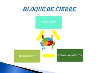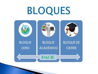 El bloque cero presenta el curso con sus objetivos y contenidos, introduce al tutor, y comparte la rúbrica de evaluación. El bloque académico presenta las actividades y recursos del curso e incluye secciones con información sobre los temas a cubrir.