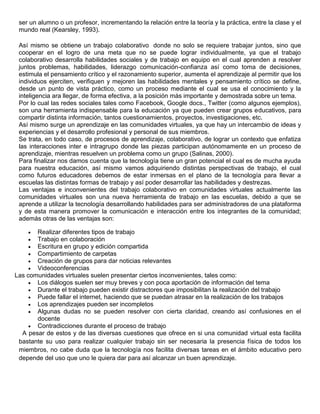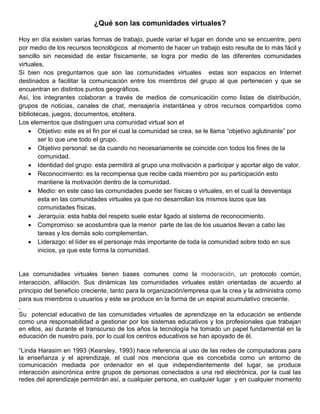 Las comunidades virtuales son espacios en Internet que facilitan la comunicación entre miembros que se encuentran en distintos lugares geográficos. Permiten colaborar a través de listas de distribución, chats y recursos compartidos. Tienen el potencial de apoyar el aprendizaje al permitir intercambios de ideas y experiencias que desarrollan habilidades a través de trabajos colaborativos. Sin embargo, también presentan inconvenientes como diálogos breves, posibles distractores y fallas de internet que dificultan el trabajo en grupo.