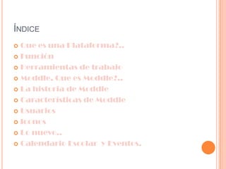 La plataforma Moodle es un sistema de gestión de cursos de código abierto que permite a los educadores crear comunidades de aprendizaje en línea. Moodle ofrece varias herramientas como chats en vivo, foros, calendarios y manuales que facilitan el aprendizaje colaborativo. La plataforma se basa en un enfoque constructivista y cuenta con una interfaz sencilla. Los usuarios pueden acceder a la plataforma con su nombre de usuario y contraseña para interactuar en los cursos.