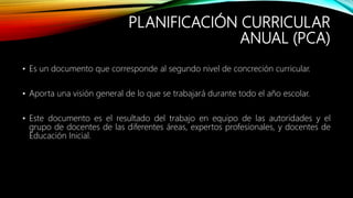 El documento describe la estructura y contenido de la Planificación Curricular Anual (PCA). La PCA es un documento que provee una visión general de lo que se enseñará durante todo el año escolar. Contiene ocho secciones que incluyen datos sobre la institución educativa, áreas, asignaturas, grados y una sección de planificación didáctica.