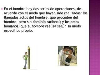 El documento discute la naturaleza de los actos humanos. Explica que los actos humanos son acciones internas y externas realizadas por la voluntad de una persona después de deliberar sobre ellas. Describe que un acto moral implica realizar lo correcto a pesar de las propias convicciones. Finalmente, señala que para que un acto sea considerado humano debe involucrar tres elementos: cognoscitivo (conocimiento), volitivo (voluntad) y libertad.