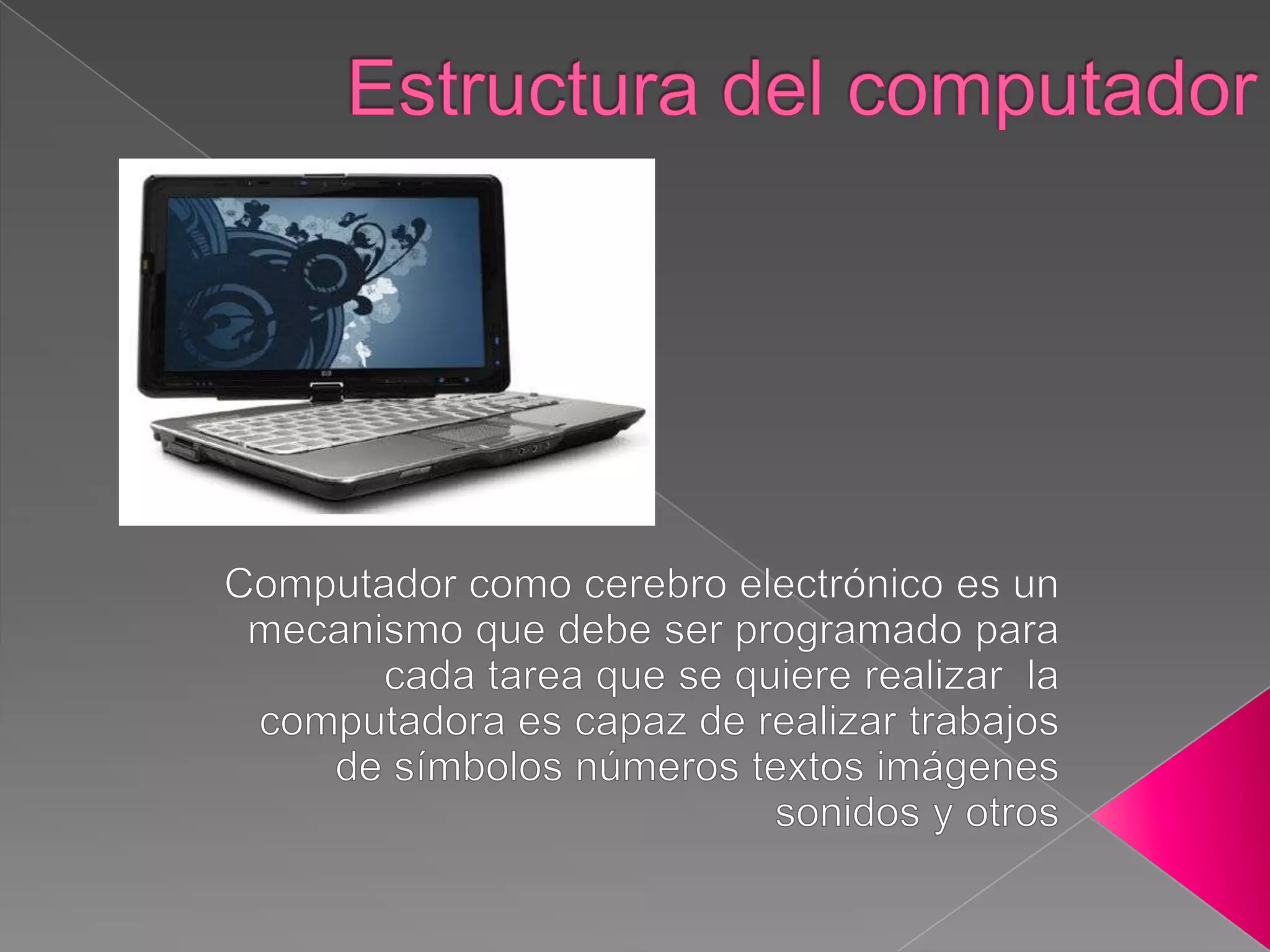 El documento describe las principales partes de un computador, incluyendo el hardware (unidad central de proceso, memoria, unidades de entrada y salida) y el software. Explica los componentes del CPU y diferentes tipos de memoria. También describe periféricos de entrada como el teclado, mouse y escáner, y periféricos de salida como el monitor e impresora. Define buses y explica tipos de software como sistemas operativos y aplicaciones.