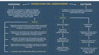 El documento describe la estructura básica de un computador, dividiéndola en hardware y software. El hardware se refiere a las partes físicas como la CPU, memoria, dispositivos de almacenamiento y comunicación. El software incluye programas, aplicaciones y el sistema operativo, que administra e interactúa con el hardware. Además, explica que el software puede ser propietario, gratuito u open source.