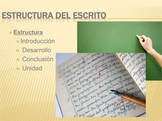 Este documento describe la estructura básica de un escrito académico, incluyendo una introducción, desarrollo, y conclusión. Explica que la introducción debe dar una visión general y establecer el punto de partida, mientras que el desarrollo presenta las ideas de manera lógica y coherente a través de párrafos. La conclusión resume los hallazgos y muestra los logros en relación con la introducción.