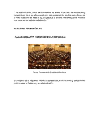 El documento describe la estructura del Estado colombiano. El Estado se divide en tres ramas de poder: la legislativa, ejecutiva y judicial. La rama legislativa incluye el Congreso y la rama ejecutiva incluye al Presidente y gabinete ministerial. La rama judicial incluye a la Corte Suprema, Consejo de Estado y otros tribunales. También existen órganos autónomos como el Consejo Nacional Electoral, Procuraduría General y Contraloría General.