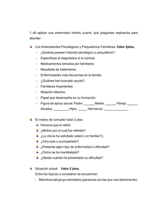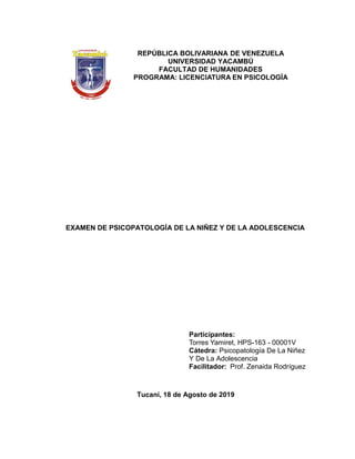 Este documento presenta un examen de psicopatología de la niñez y adolescencia realizado por una estudiante de psicología. Incluye preguntas sobre antecedentes familiares, motivo de consulta, situación actual e historia sexual del paciente. También contiene un caso clínico de un adolescente con alucinaciones y desorientación que es evaluado a través de un esquema de examen mental que analiza su conciencia, orientación, atención, memoria, lenguaje, pensamiento, afectividad y sensopercepción.