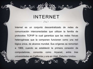 El documento resume los conceptos clave de Internet, incluyendo su historia y estructura descentralizada basada en TCP/IP. También describe los sistemas DNS, las redes LAN locales, las redes MAN metropolitanas de alta velocidad, y las redes WAN de área amplia que conectan múltiples LAN en diferentes ubicaciones.