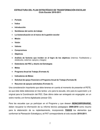 Este documento presenta la estructura y contenido requerido para el Plan Estratégico de Transformación Escolar (PETE) de una escuela para el ciclo escolar 2010-2011, incluyendo una guía detallada para la autoevaluación de la escuela y la identificación de necesidades, así como la definición de misión, visión y valores. El documento provee información para el análisis y mejora continua de la gestión escolar en dimensiones pedagógicas, organizativas, administrativas y de participación social.