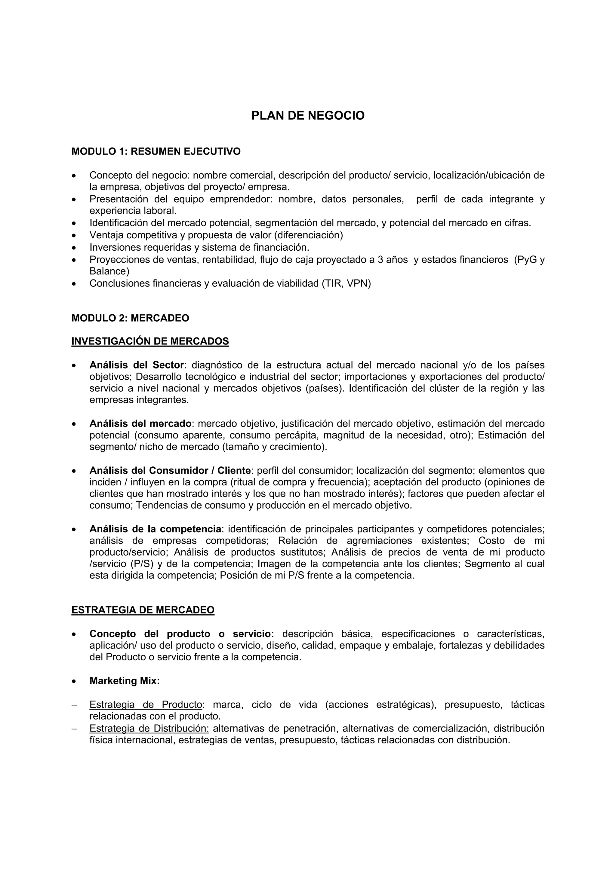 Este plan de negocio describe un nuevo proyecto empresarial. Incluye secciones sobre el resumen ejecutivo con la idea del negocio, el equipo, el mercado y las proyecciones financieras, un análisis de mercado y la estrategia de marketing, los requerimientos técnicos y de producción, la estructura organizacional y aspectos legales, el plan financiero y la evaluación del impacto del proyecto. El plan contiene la información necesaria para evaluar la viabilidad técnica y financiera del nuevo negocio.