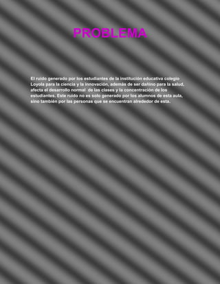 El documento describe un proyecto para abordar el problema del ruido excesivo generado por estudiantes en una escuela, que afecta la salud y concentración. El objetivo es implementar una estrategia para crear conciencia sobre la contaminación auditiva mediante charlas y medición del ruido antes y después con sensores. La justificación es que el ruido actual está afectando el rendimiento académico y la salud de la comunidad educativa.