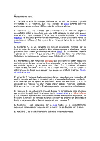 La estructura del suelo se compone de varios horizontes que se diferencian por sus propiedades físicas, químicas y composición. Los principales horizontes son el H, formado por acumulación de materia orgánica; el O, con alta presencia de materia orgánica poco descompuesta; el A, con materia orgánica bien descompuesta; los horizontes E y B, que contienen materiales eluviados e iluviales respectivamente; el C, compuesto por la roca no consolidada; y el R, que representa la roca madre