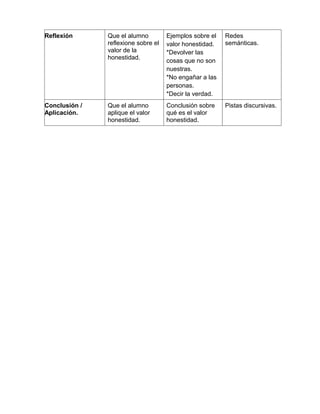 El documento presenta una estructura didáctica para enseñar el valor de la honestidad a los estudiantes. La estructura incluye 7 segmentos con objetivos específicos para presentar, problematizar, informar, vincular, retroalimentar, reflexionar y concluir sobre el valor de la honestidad utilizando diferentes estrategias como dramatización, preguntas clave, exposición, analogías, estructuras cognitivas, redes semánticas y pistas discursivas.