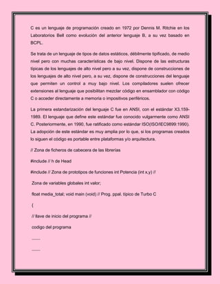 Este documento describe el lenguaje de programación C y sus características principales. C fue creado en 1972 por Dennis Ritchie y es un lenguaje de tipos de datos estáticos y débilmente tipificado que permite control a bajo nivel. El documento también explica los tipos de datos básicos como char y los métodos de entrada y salida estándar como printf, scanf y getchar.