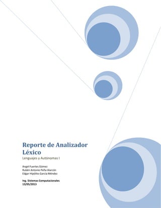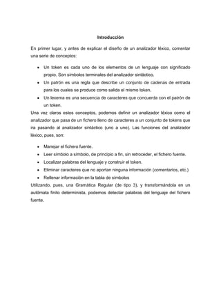 El documento presenta el diseño de un analizador léxico para un lenguaje de programación. Describe los conceptos clave como tokens, lexemas y patrones. Explica las funciones del analizador léxico como manejar el archivo fuente, leer símbolos, localizar palabras clave y eliminar comentarios. También detalla los tipos de datos, operadores, sentencias y estructura general del programa reconocidos por el analizador léxico.