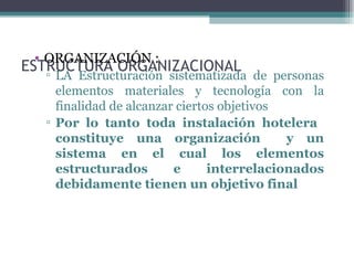 El documento describe la estructura organizacional y operacional de un hotel tradicional. Explica que un hotel es una organización que ofrece alojamiento y alimentos, y describe los diferentes departamentos como recepción, limpieza, mantenimiento, seguridad, ventas y relaciones públicas, cada uno con objetivos específicos para satisfacer las necesidades de los huéspedes.