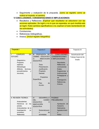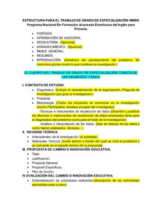 El documento describe la estructura para un trabajo de grado de especialización en enseñanza del inglés para primaria. La estructura consta de cinco partes principales: 1) contexto de estudio, 2) revisión teórica, 3) propuesta de cambio educativo, 4) desarrollo y evaluación de la propuesta, y 5) conclusiones e implicaciones. Cada parte contiene secciones específicas como diagnóstico, objetivos, metodología, antecedentes, referentes teóricos y resultados.